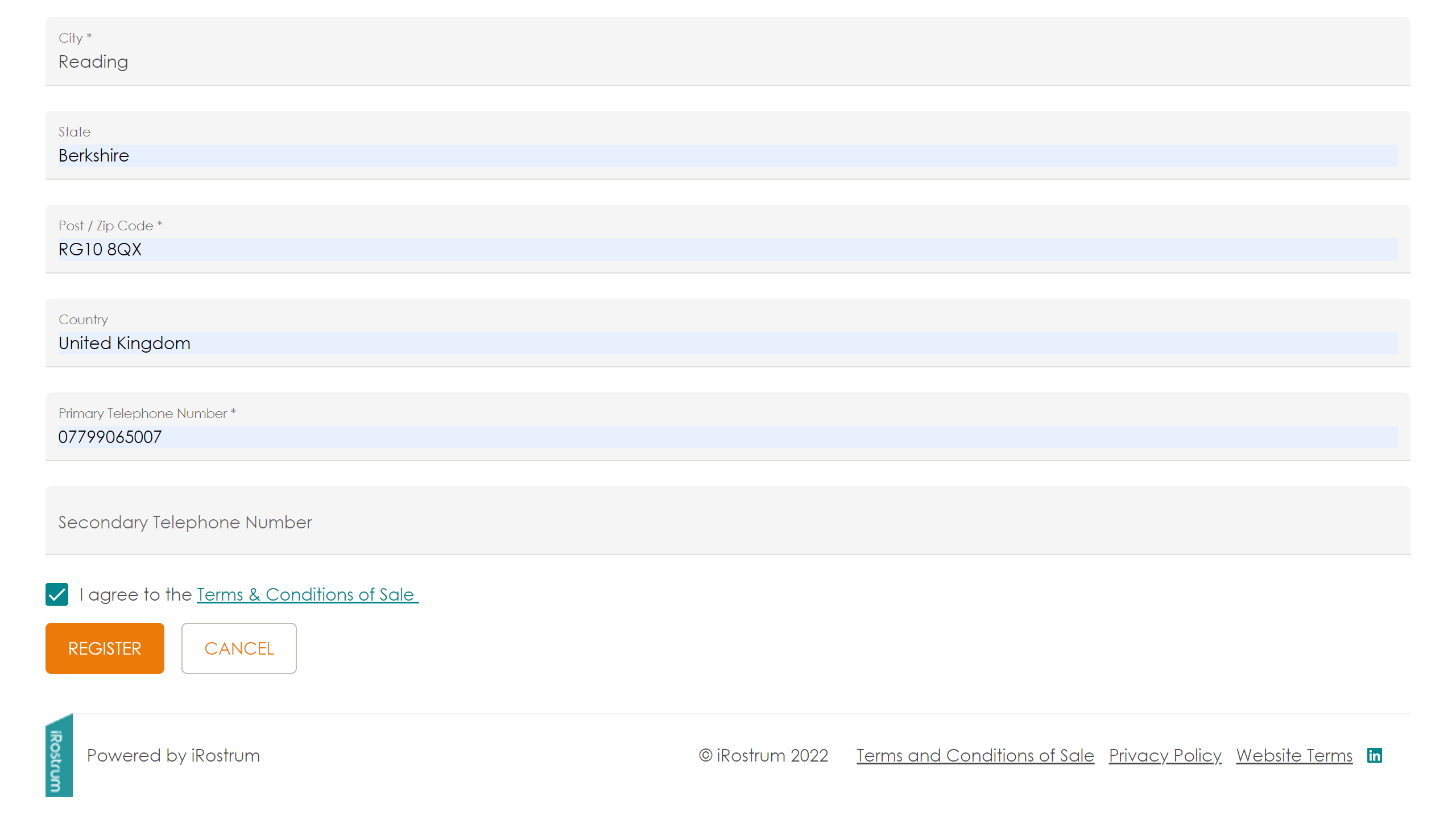 Users will need to provide their address and telephone number. They will also need to Accept your Terms and Conditions as part of the registration process.
