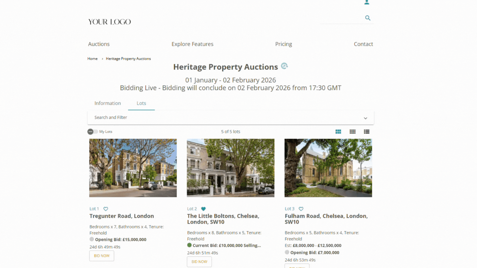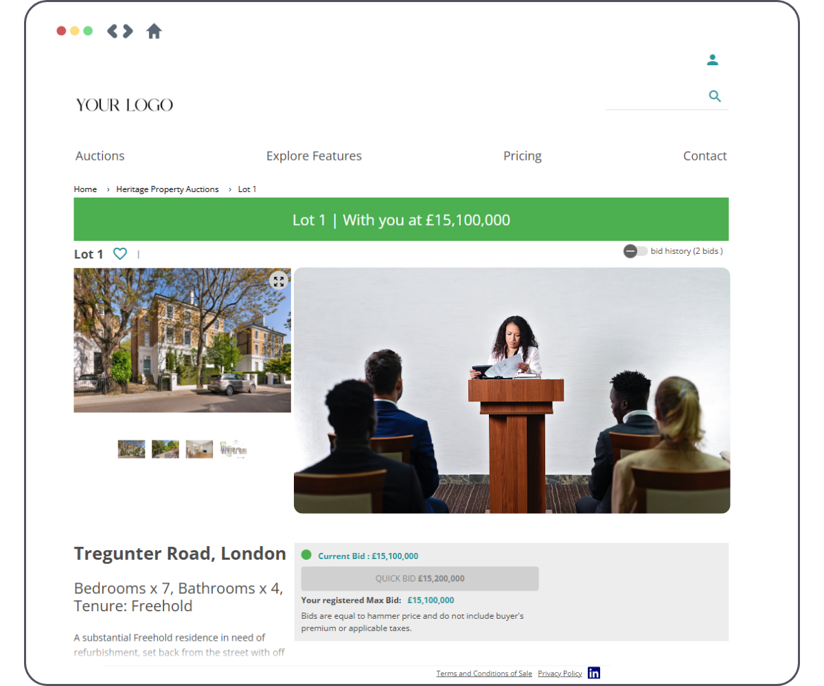Run professional property auctions on your own fully branded platform — designed to support residential, land, and commercial property sales, while delivering a trusted, compliant buyer experience.